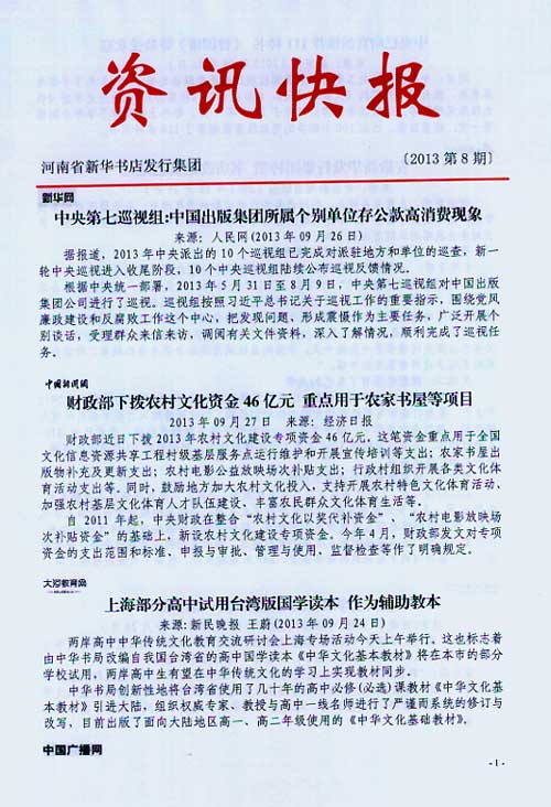 來(lái)源:河南省新華書(shū)店發(fā)行集團(tuán)有限公司  作者:河南省新華書(shū)店發(fā)行集團(tuán)有限公司  發(fā)布時(shí)間:2013/9/27 14:16:17  閱讀次數(shù):5824